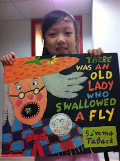 當我說完"There was an old lady who swallowed a fly", 孩子們帶著純真的眼神問我, "Teacher Sherry: old lady 她死了嗎?" "Teacher Sherry: 妳是說 old lady swallowed a fly and a horse?" 這幾個孩子意猶未盡的追著我問東問西的,看著這些孩子對於這本繪本這麼的喜愛,心裡也開始策畫著"延伸教學"的活動.
